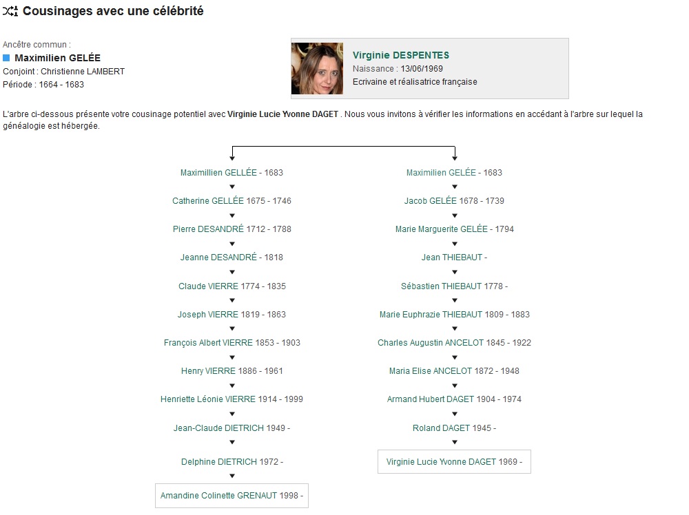 Virginie DESPENTES, Ecrivain française, descendant de Maximillien GELLÉE et de Christine LAMBERT