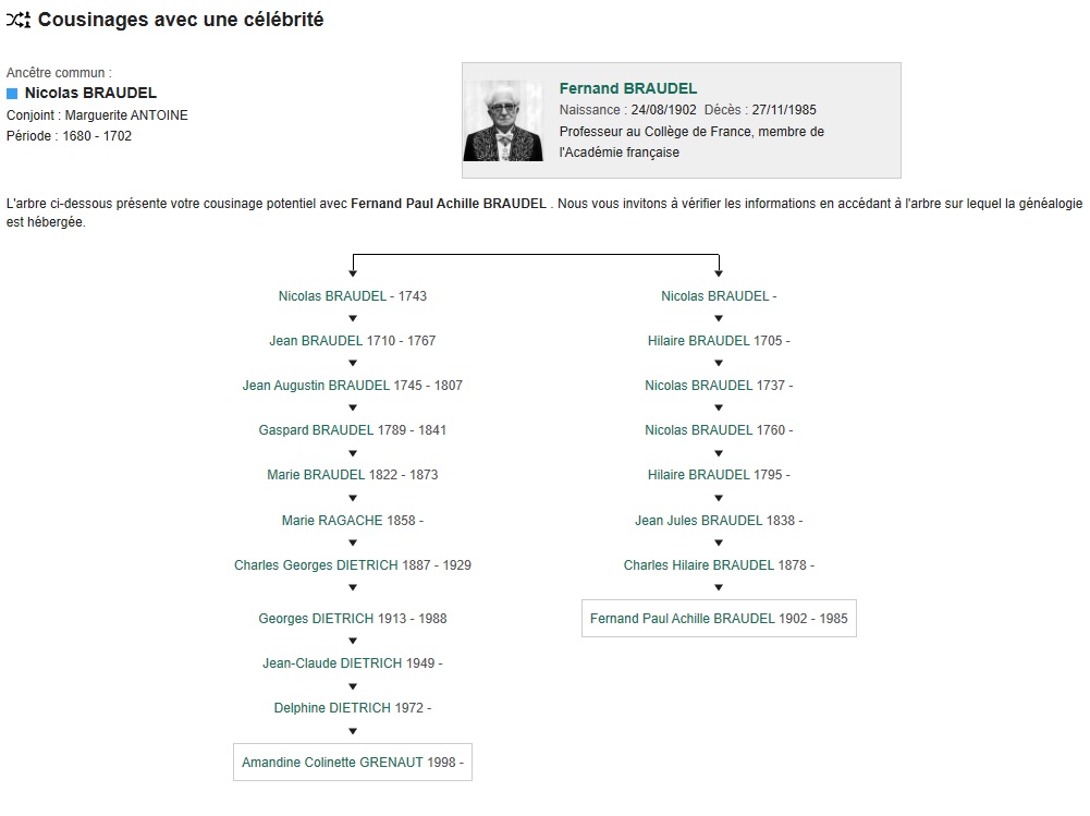 Fernand BRAUDEL, Professeur au Collège de France, membre de l'Académie française (Wiki), descendant de Nicolas BRAUDEL et de Margueritte ANTOINE