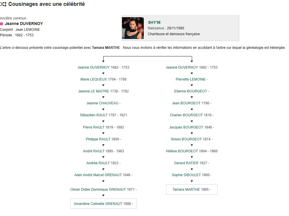 Tamara "SHY'M" MARTHE, Auteure-compositrice-interprète, danseuse, réalisatrice et animatrice de télévision (Wiki), descendant de Père inconnu et de Jeanne DUVERNOY
