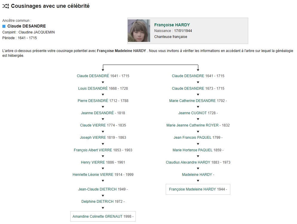 Françoise HARDY, Auteur, compositeur et interprète (Wiki), descendant de Claude DESANDRÉ et de Claude JACQUEMIN