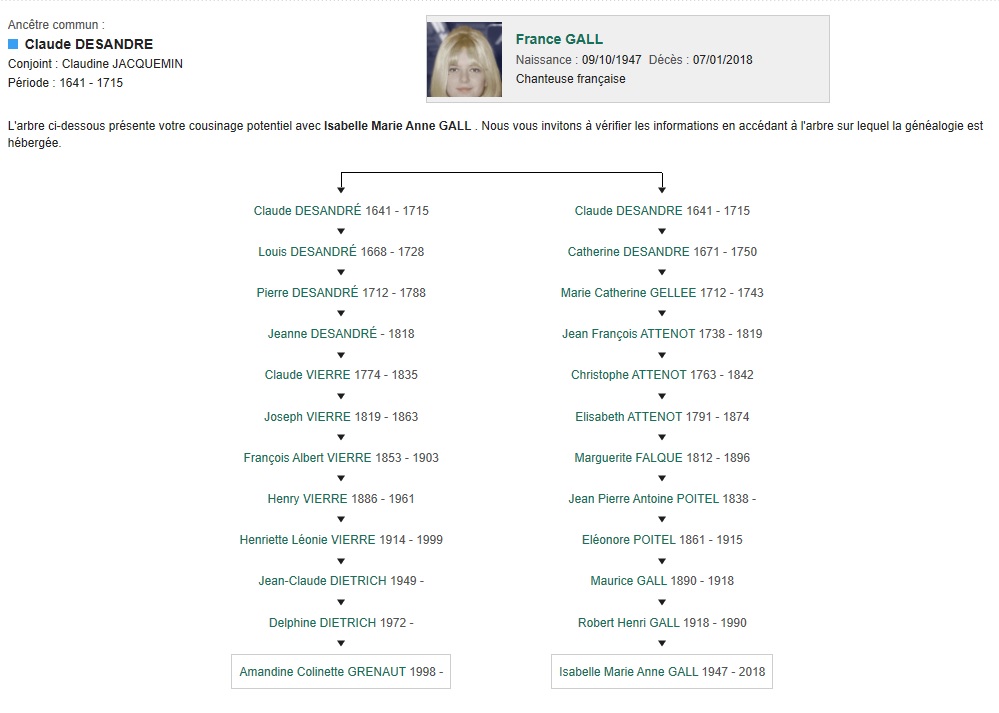 France GALL, Chanteuse (Wiki), descendant de Claude DESANDRÉ et de Claude JACQUEMIN
