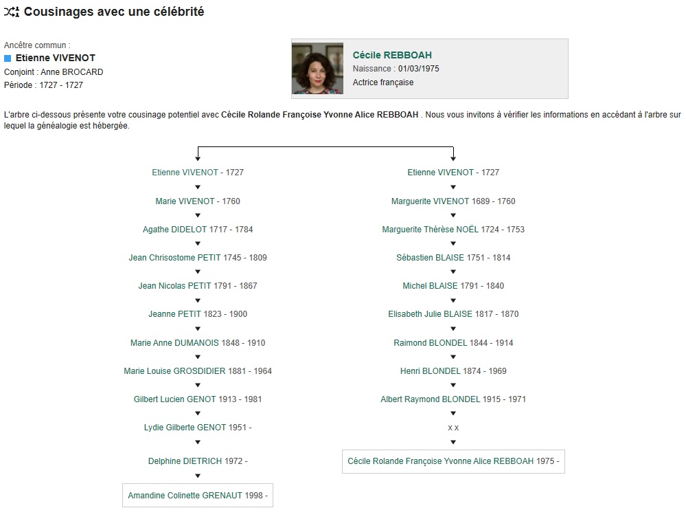 Cécile REBBOAH, Actrice française (Wiki), descendant de Etienne VIVENOT et de Anne BROCARD