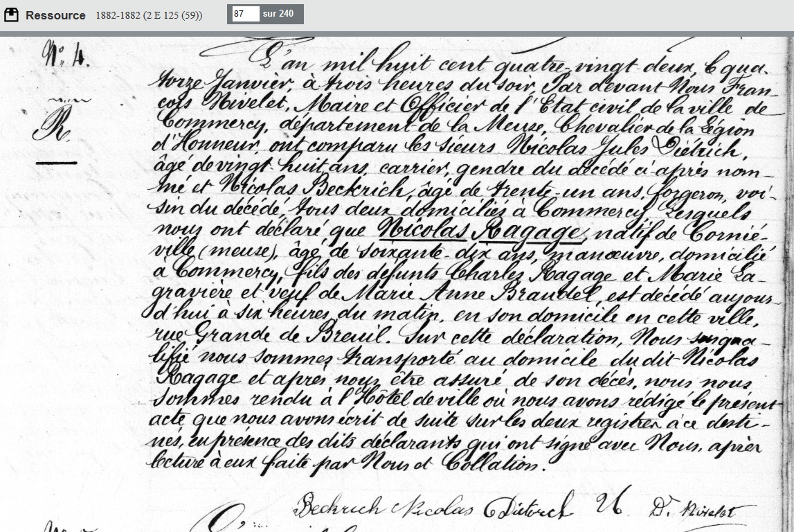 - décédé le 14 janvier 1882 à Commercy - Meuse (55) à l'âge de 69 ans 10 mois et 1 jour