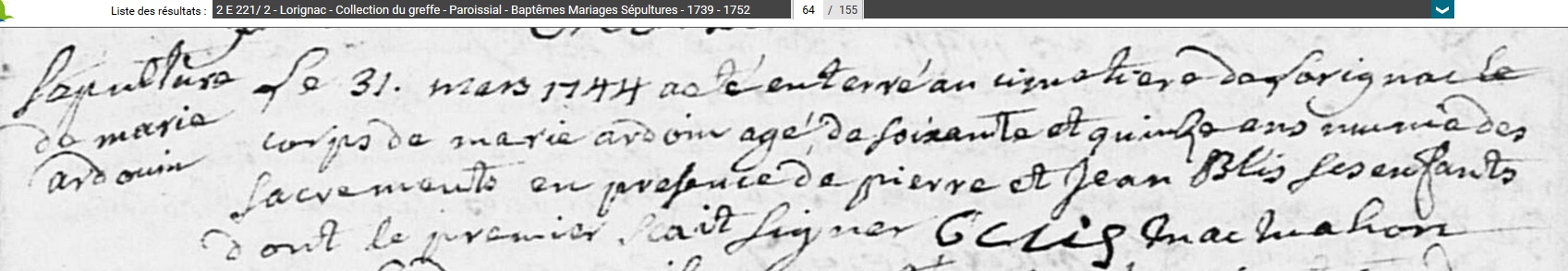 décédée le 31 mars 1744 à Lorignac - Charente-Maritime (17) à l'âge de 75 ans environ