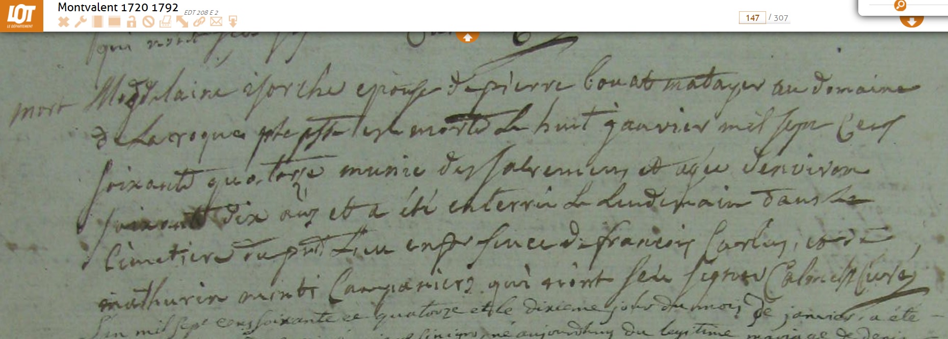 décédée le 8 janvier 1774 à Montvalent - Lot (46) à l'âge de 66 ans environ