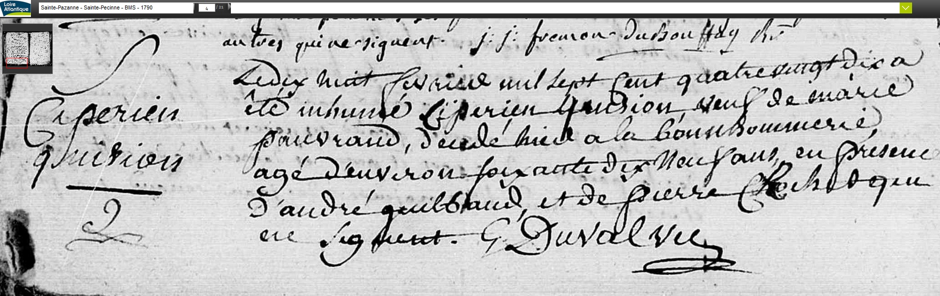 décédé le 17 février 1790 à Sainte-Pazanne - Loire-Atlantique (44) à l'âge de 80 ans 3 mois et 27 jours