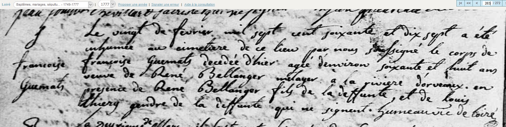 décédée le 19 février 1777 à Loiré - Maine-et-Loire (49) à l'âge de 66 ans 1 mois et 10 jours