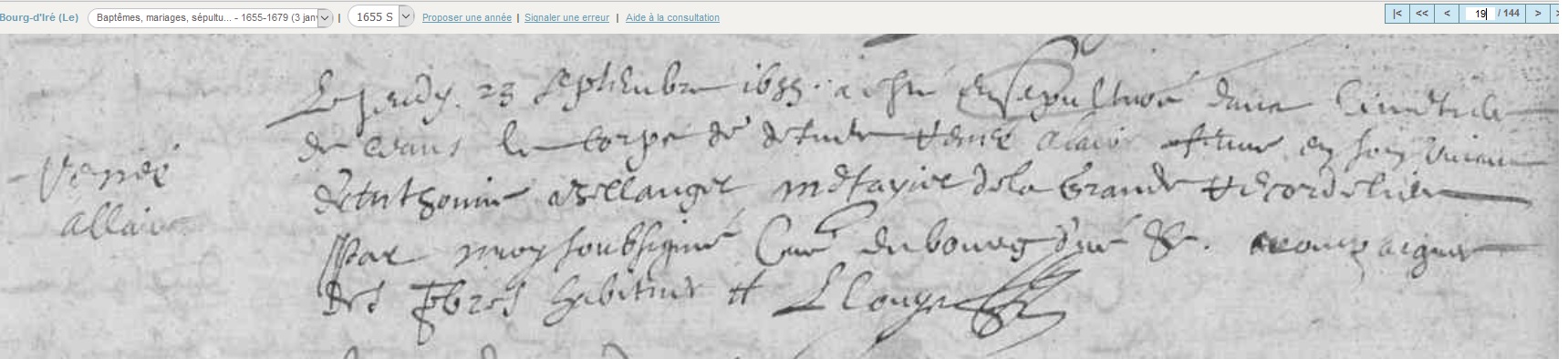 décédée le 23 septembre 1655 à Le Bourg-d'Iré - Maine-et-Loire (49) à l'âge de 55 ans environ