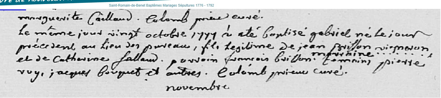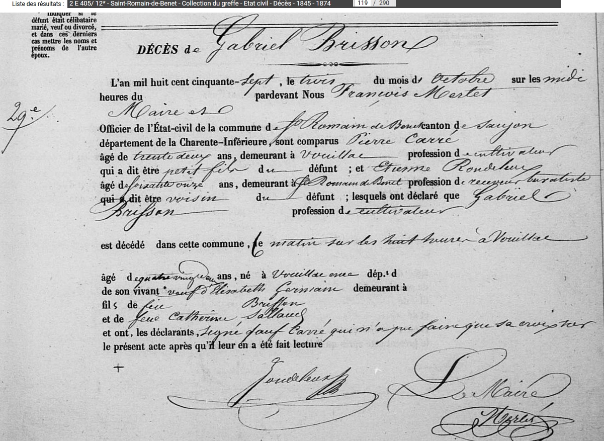 - décédé le 3 octobre 1857 à Saint-Romain-de-Benet - Charente-Maritime (17) à l'âge de 79 ans 11 mois et 14 jours
