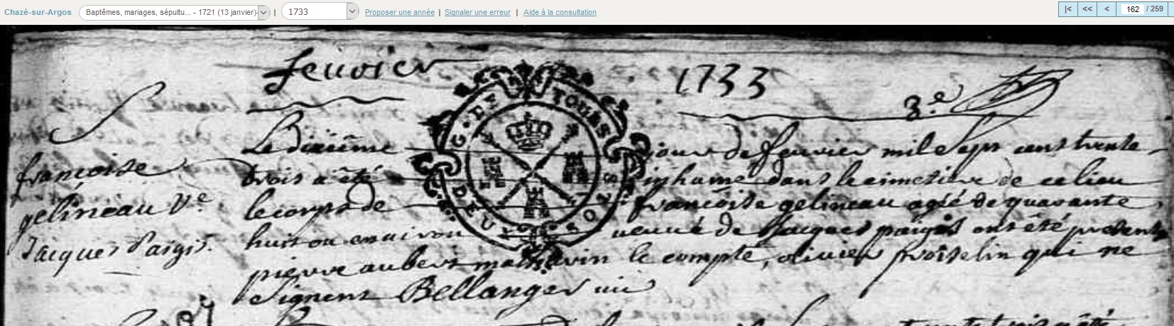 décédée le 10 février 1733 à Chazé-sur-Argos - Maine-et-Loire (49) à l'âge de 44 ans 5 mois et 27 jours