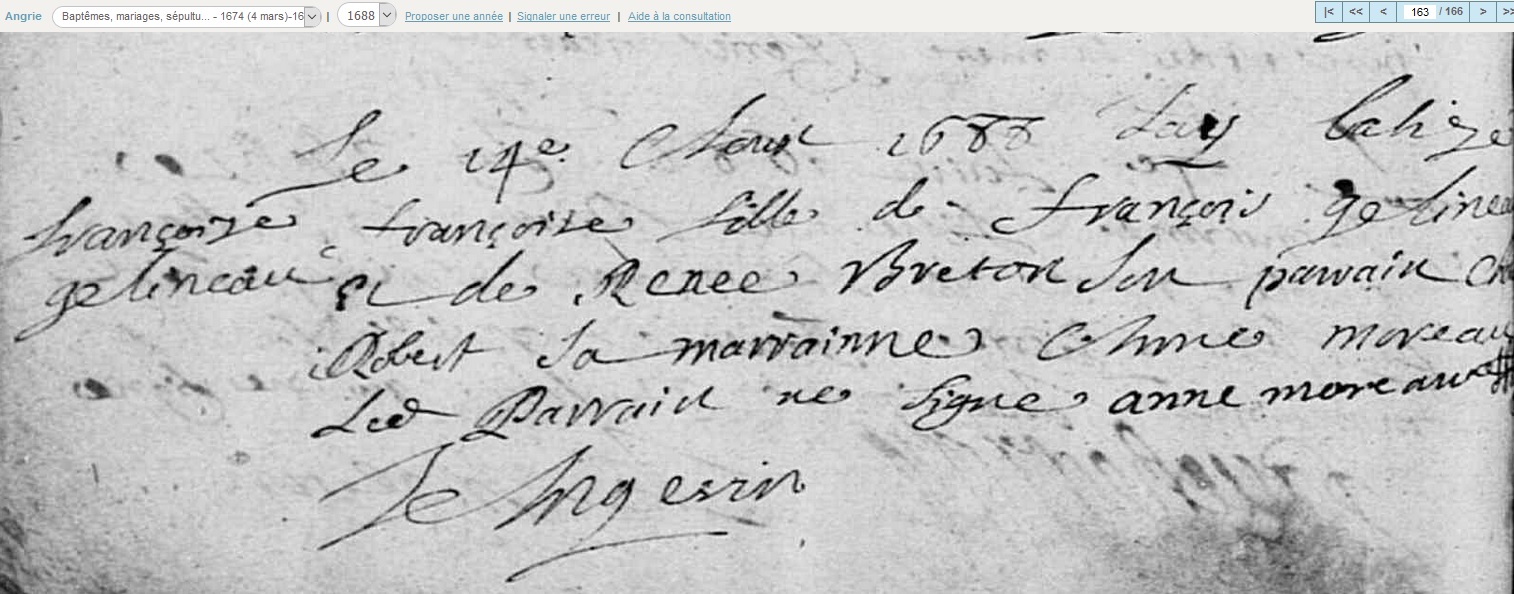 née le 14 août 1688 à Angrie - Maine-et-Loire (49)