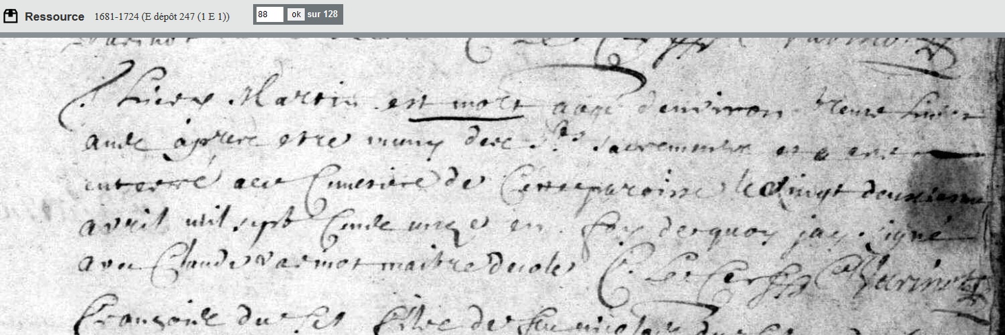 décédé le 22 avril 1711 à Méligny-le-Grand - Meuse (55) à l'âge de 38 ans environ