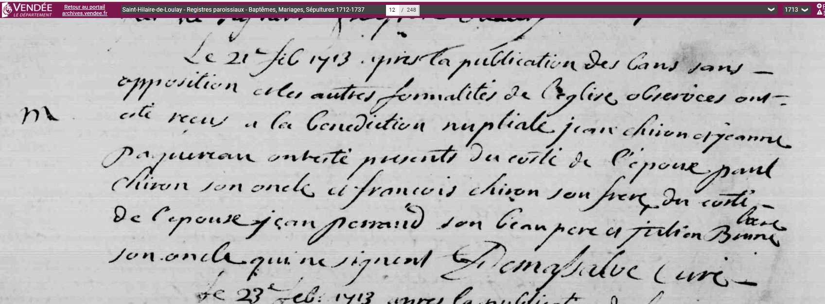 marié le 21 février 1713 à Saint-Hilaire-de-Loulay - Vendée (85), avec