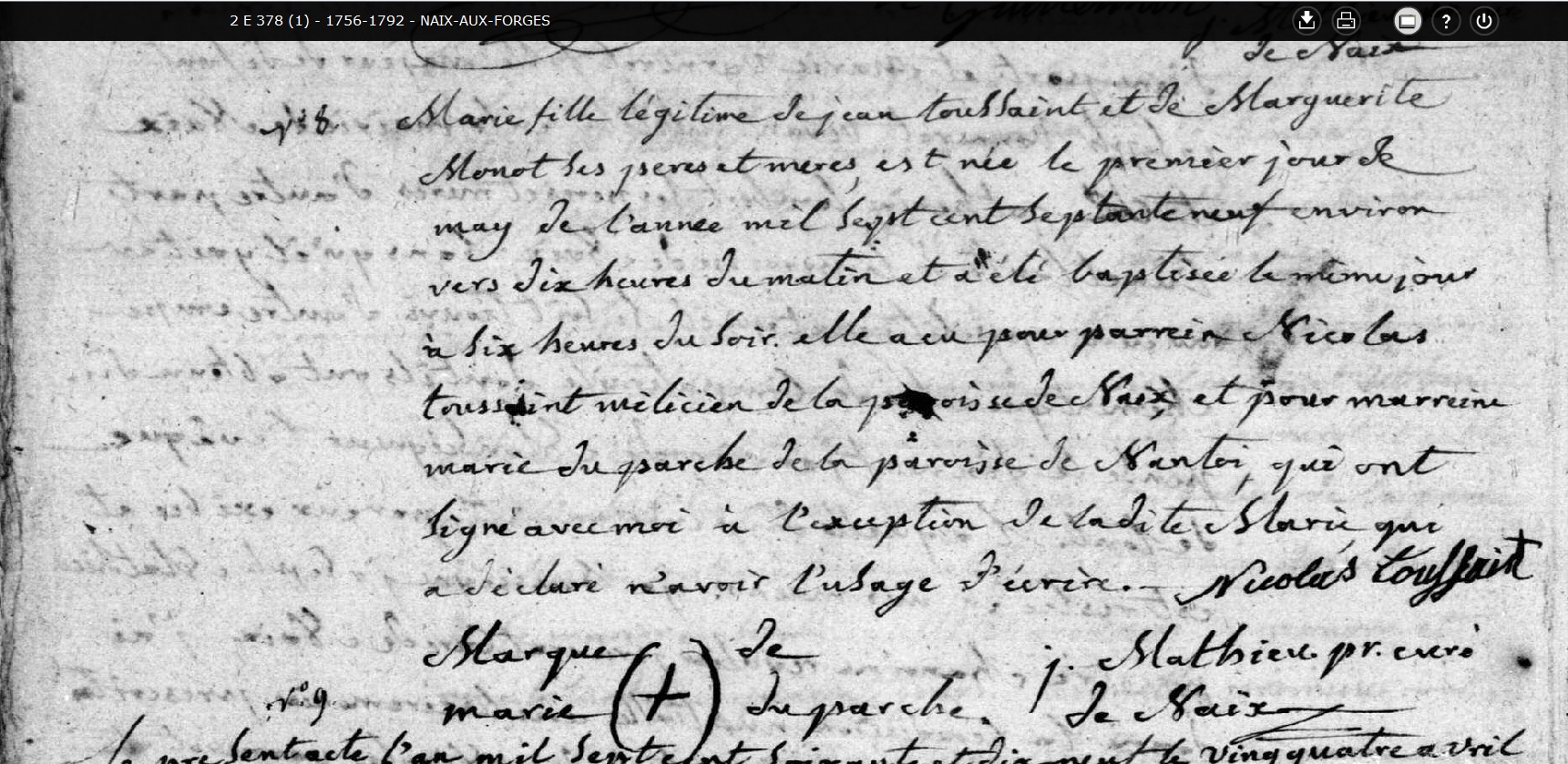 Veuve de Nicolas Mauny.Filleule de Nicolas Toussaint, milicien de la paroisse.