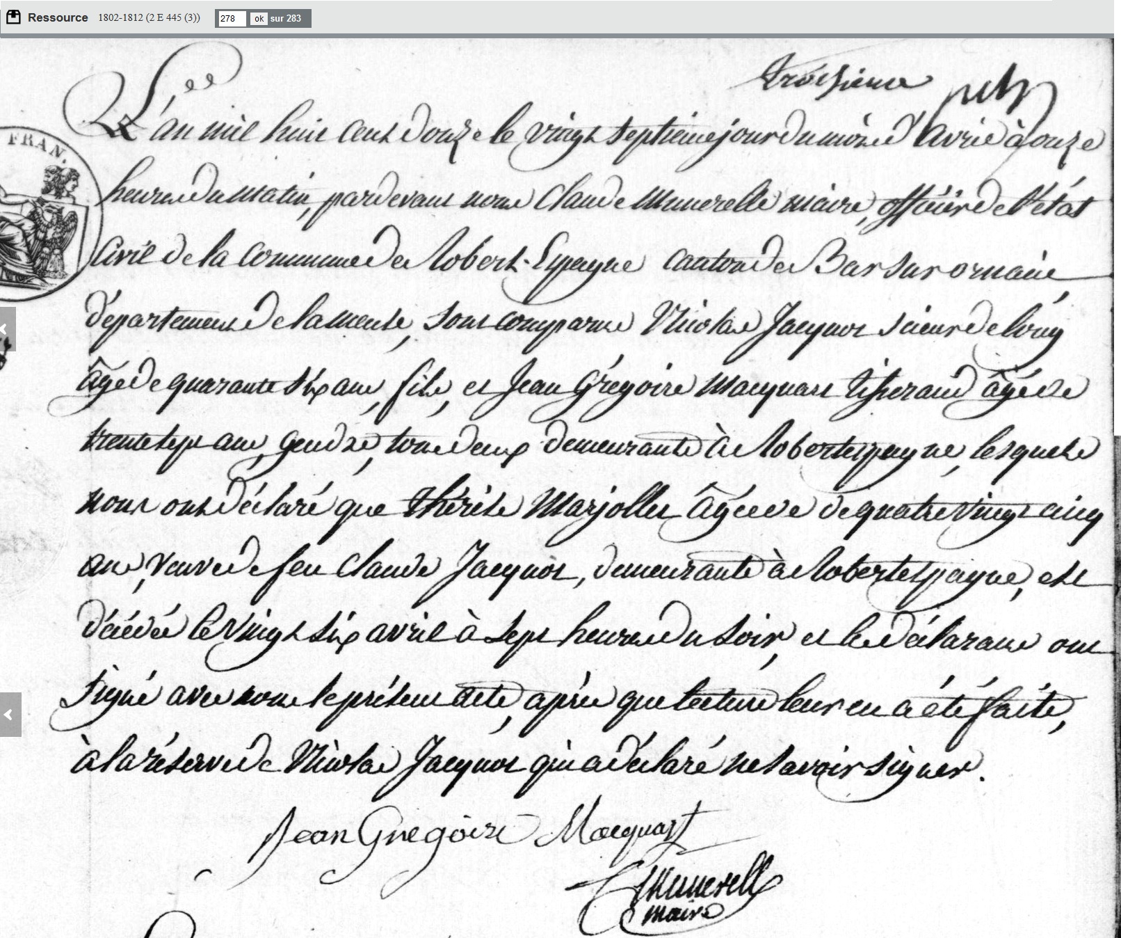 décédée le 26 avril 1812 à Robert-Espagne - Meuse (55) à l'âge de 86 ans 8 mois