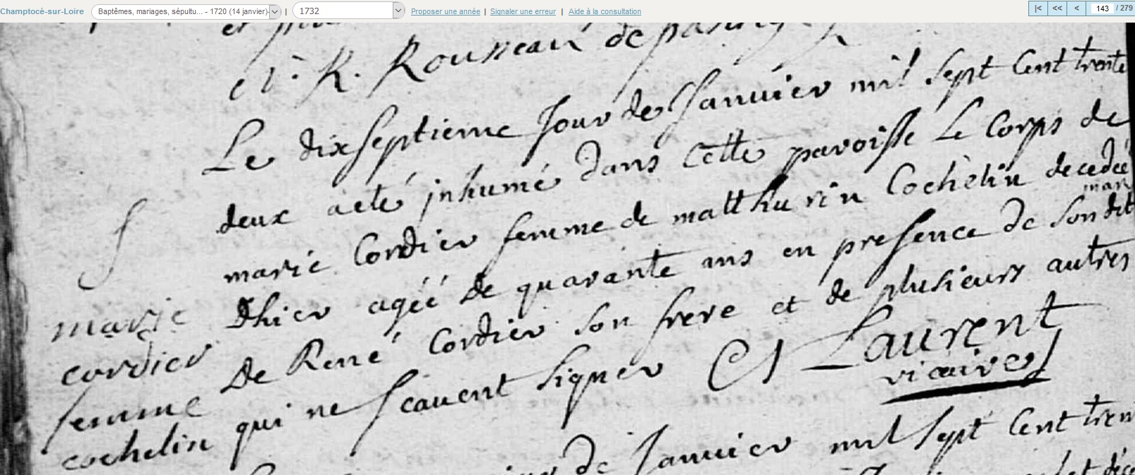 décédée le 16 janvier 1732 à ChamptocĂ©-sur-Loire - Maine-et-Loire (49) à l'âge de 40 ans 5 mois et 2 jours