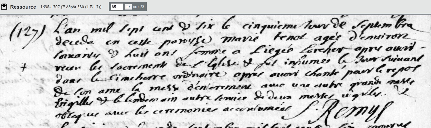 décédée le 5 septembre 1706 à Sorcy-Saint-Martin - Meuse (55) à l'âge de 68 ans environ