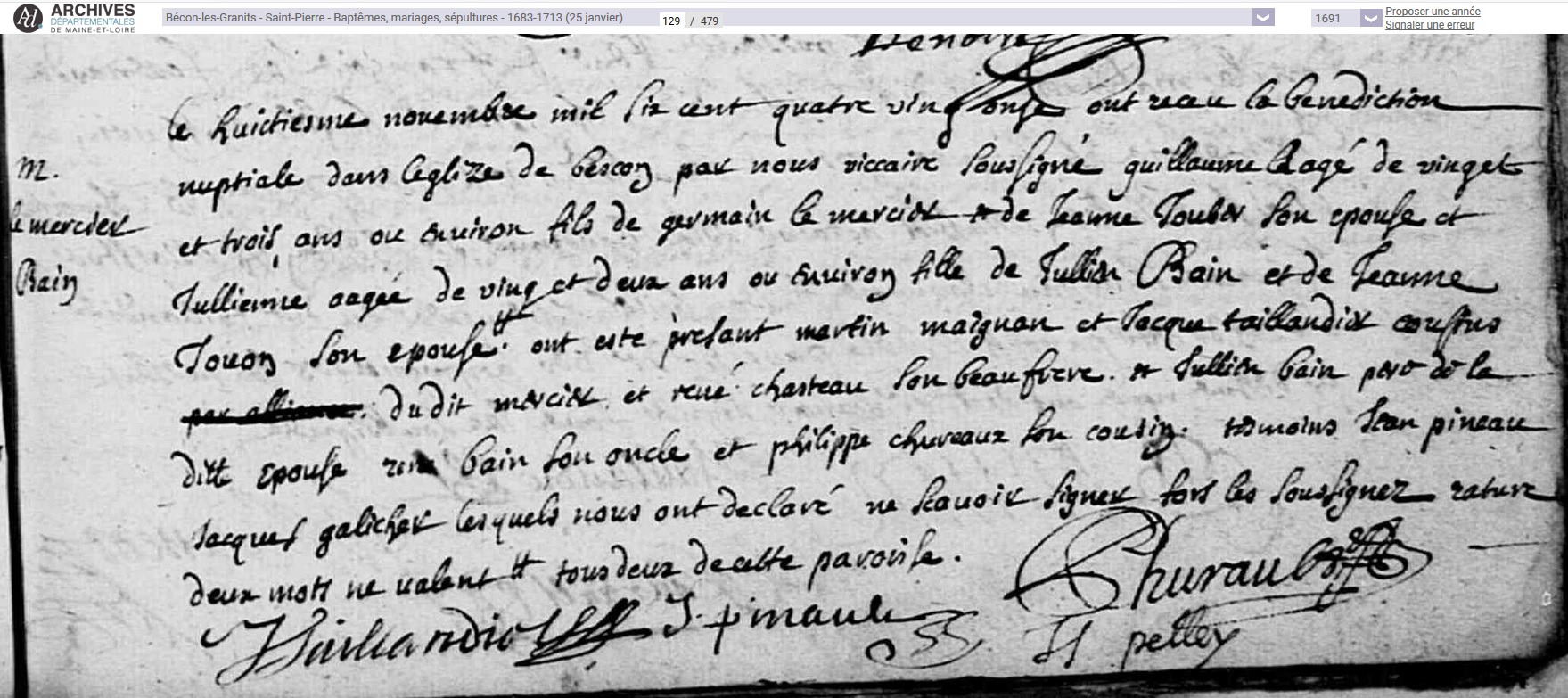 marié le 8 novembre 1691 à Bécon-les-Granits - Maine-et-Loire (49), avec