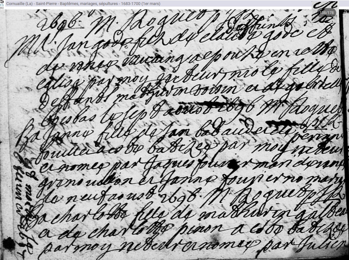mariée le 7 août 1696 à La Cornuaille - Maine-et-Loire (49), avec