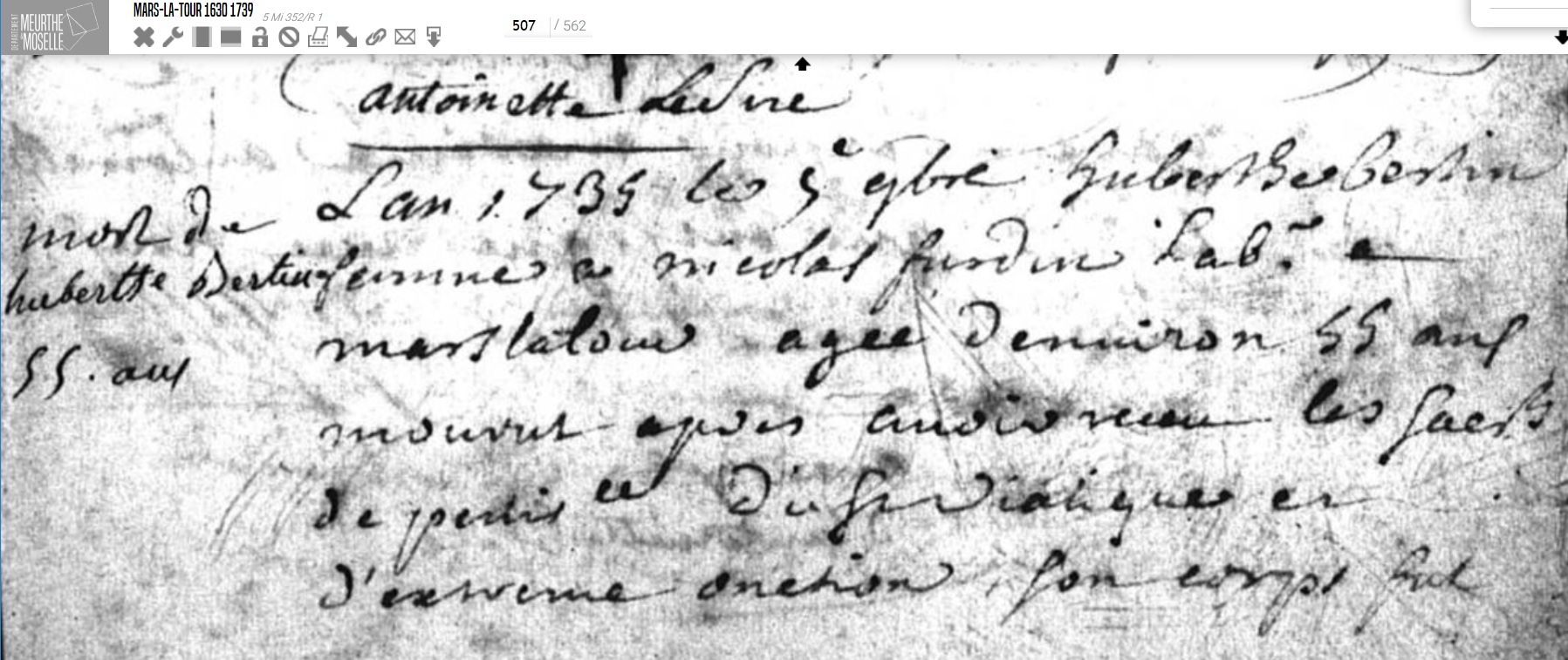 décédée le 5 octobre 1735 à Mars-la-Tour - Meurthe-et-Moselle (54) à l'âge de 55 ans environ