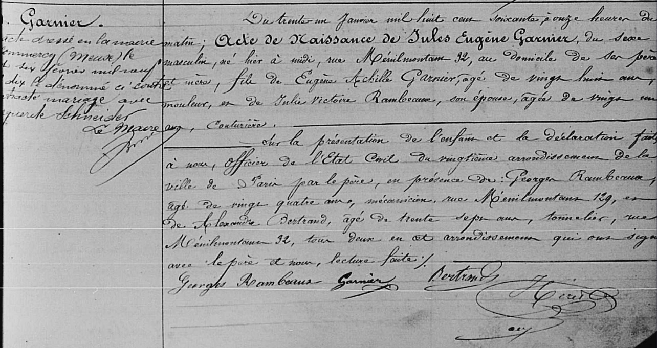 Né au domicile de ses parents, 92 rue Ménilmontant dans le 20ème arrondissement. Décédé à Commercy, 49 rue Carnot.