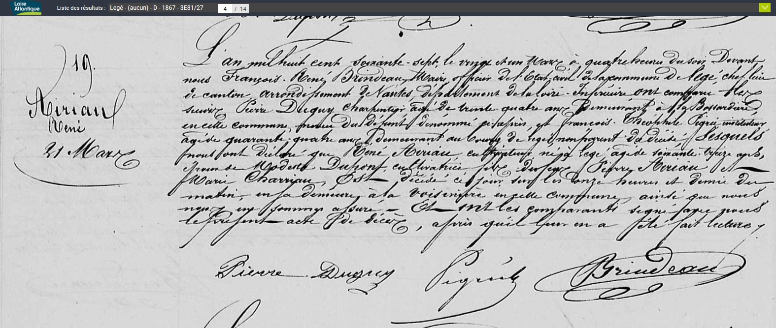 - décédé le 21 mars 1867 à Legé - Loire-Atlantique (44) à l'âge de 73 ans 3 mois et 24 jours