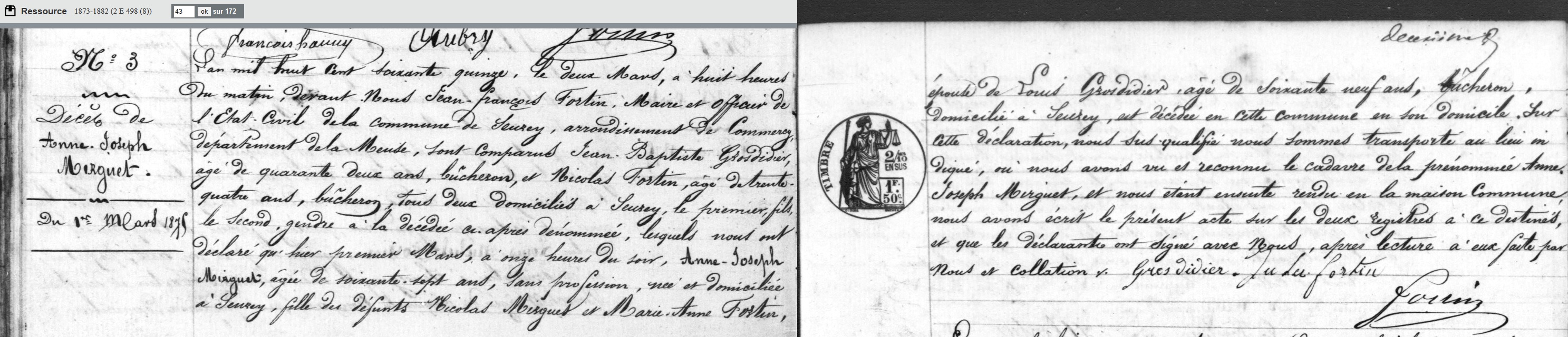 - décédée le 1er mars 1875 à Seuzey - Meuse (55) à l'âge de 67 ans 4 mois et 12 jours
