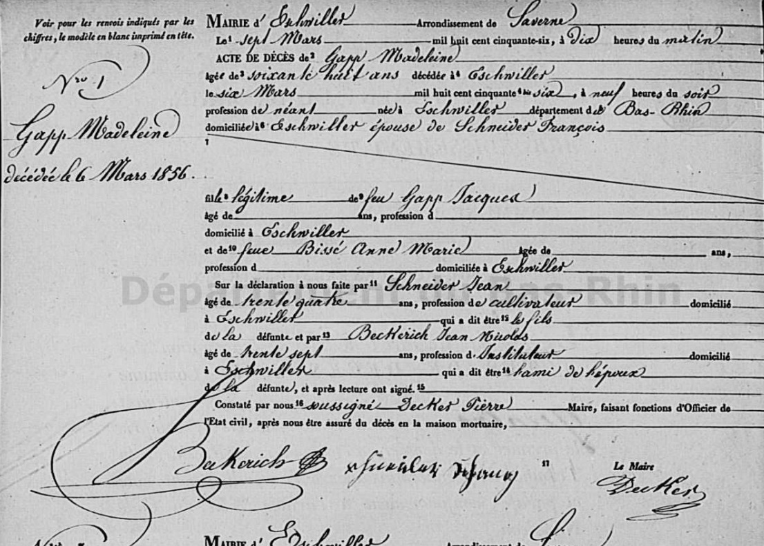 - décédée le 6 mars 1856 à Eschwiller - Bas-Rhin (67) à l'âge de 67 ans 1 mois et 25 jours