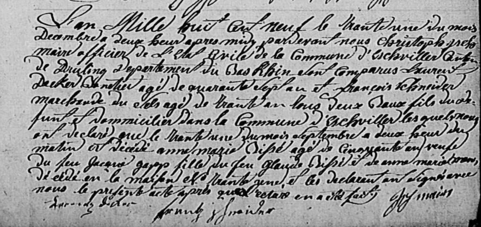 - décédée le 30 septembre 1809 à Eschwiller - Bas-Rhin (67) à l'âge de 55 ans 11 mois et 18 jours