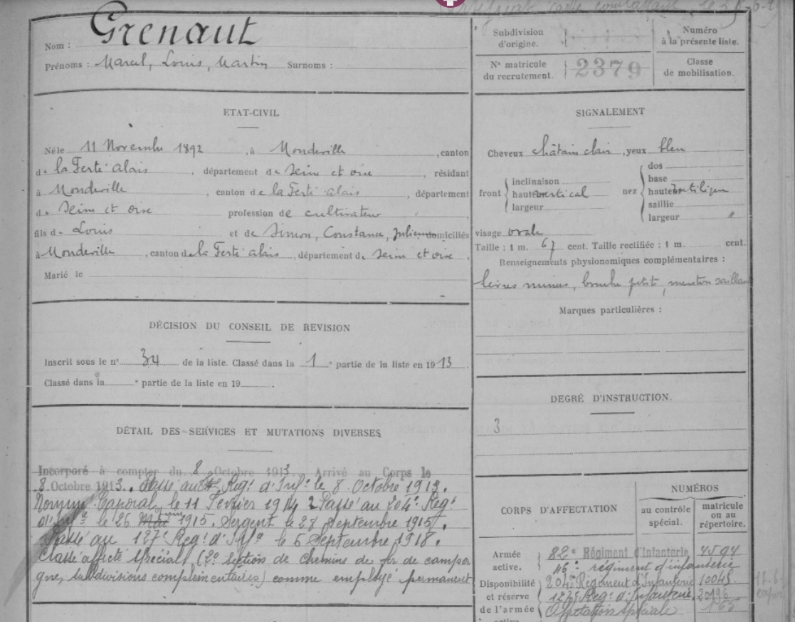 - né le 11 novembre 1892 à Mondeville - Essonne (91)