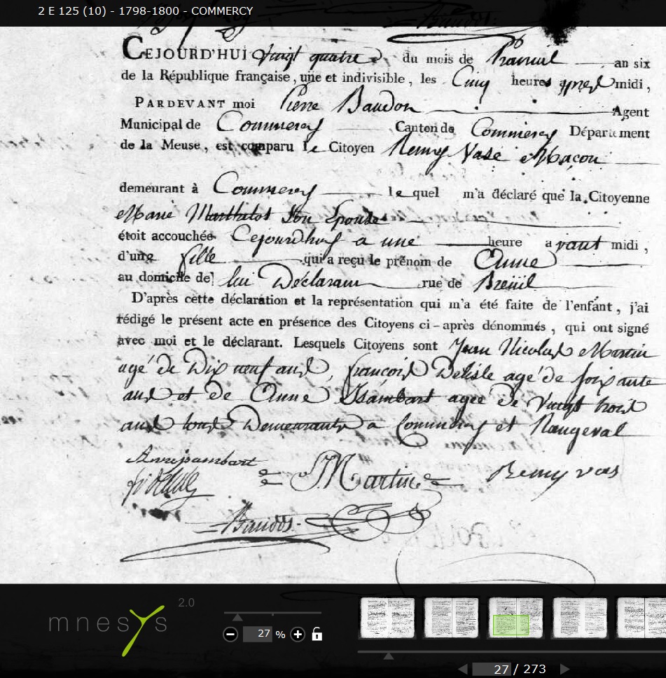 Date de naissance : 24 Prairial an VI. A noter acte de naissance de Anne VASE (sa soeur?) le 25/07/1792 (p 228 1780-1792 COMMERCY Saint-Pantaléon)