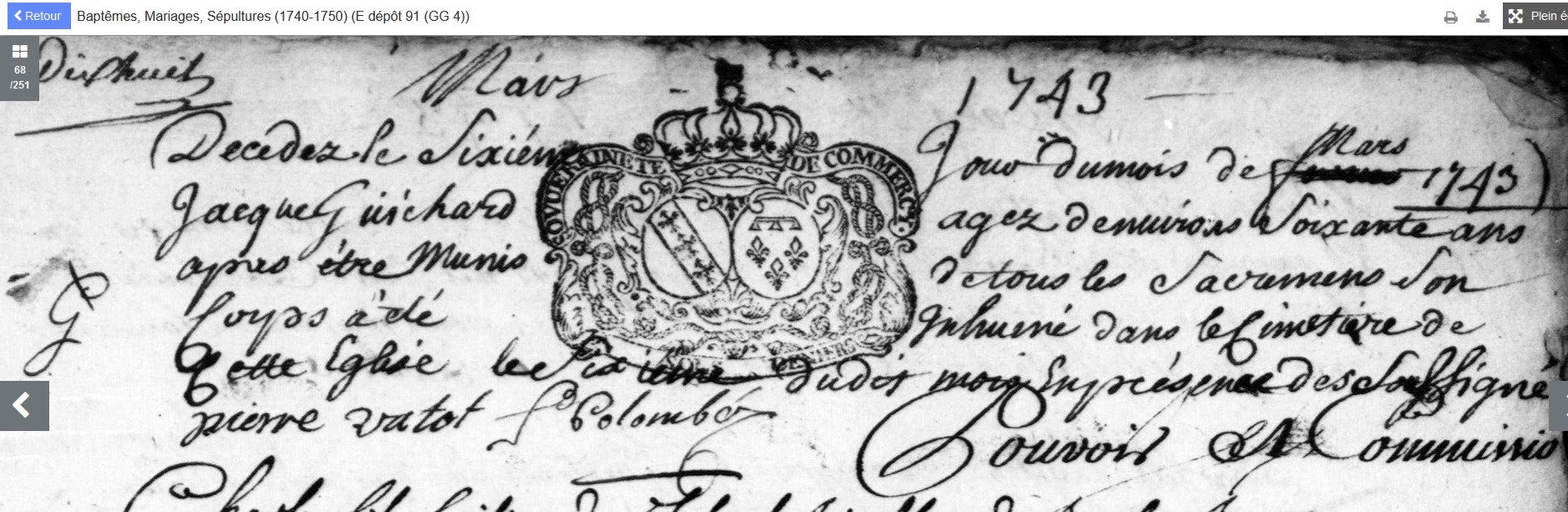 décédé le 6 mars 1743 à Commercy - Meuse (55) à l'âge de 58 ans 4 mois et 7 jours
