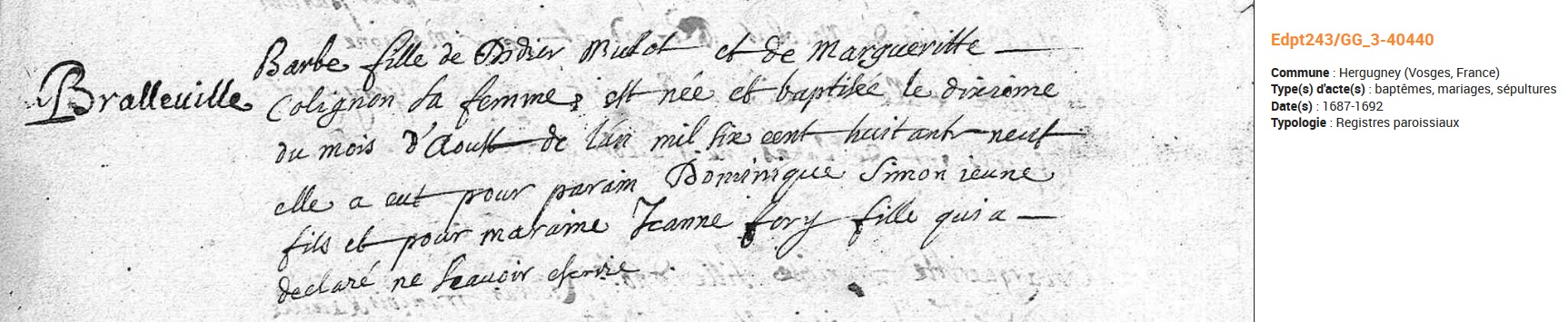 Bralleville : à consulter sur Hergugney dans les Vosges pour les actes avant 1768