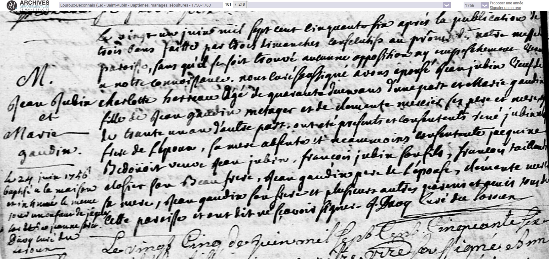 mariée le 21 juin 1756 à Le Louroux-Béconnais - Maine-et-Loire (49), avec