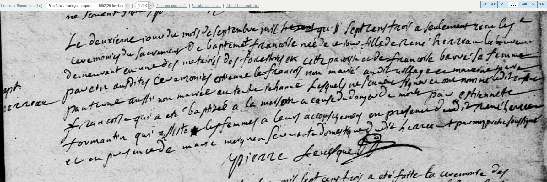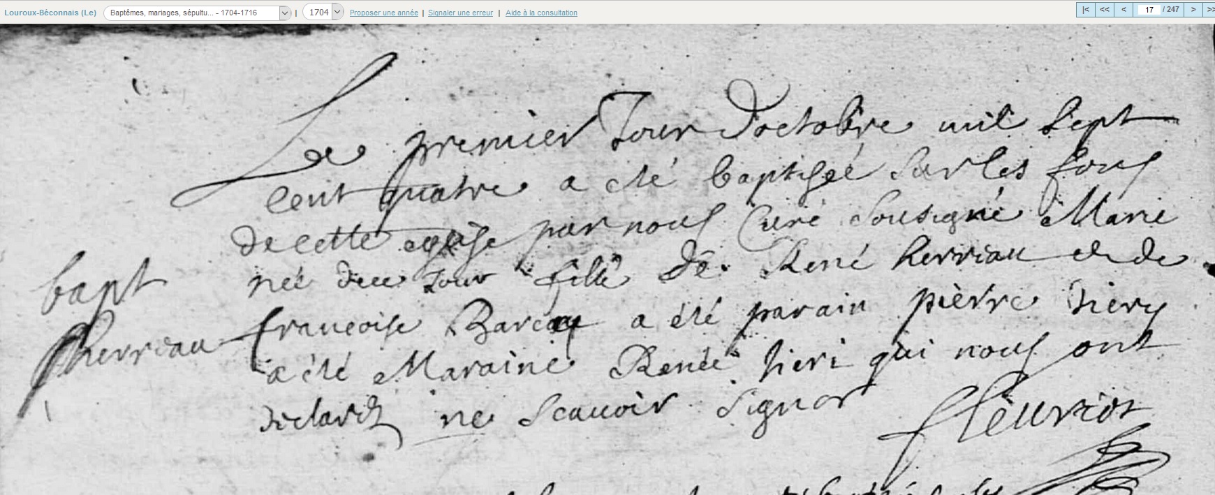 née le 1er octobre 1704 à Le Louroux-Béconnais - Maine-et-Loire (49)