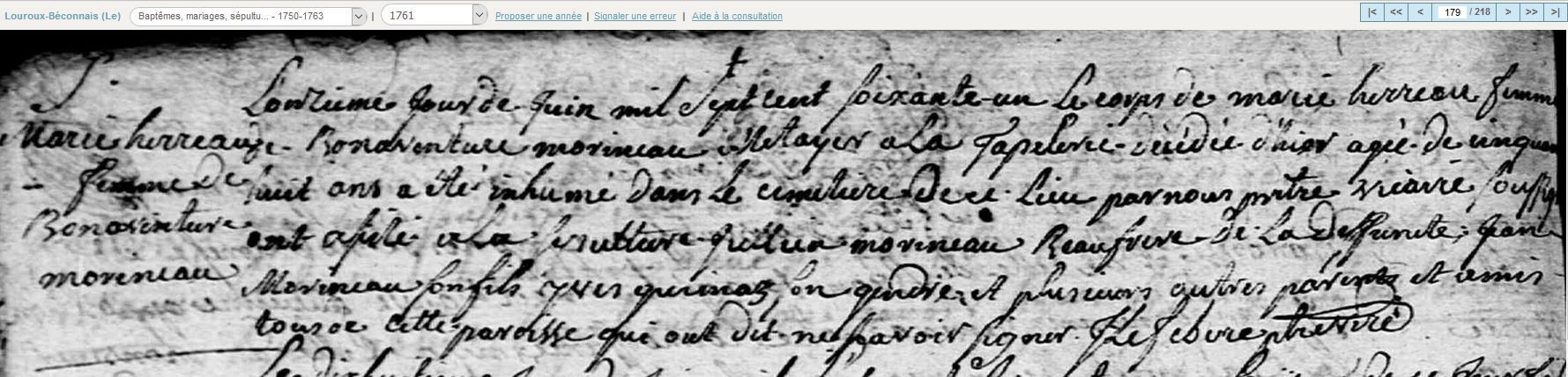 décédée le 10 juin 1761 à Le Louroux-Béconnais - Maine-et-Loire (49) à l'âge de 56 ans 8 mois et 9 jours