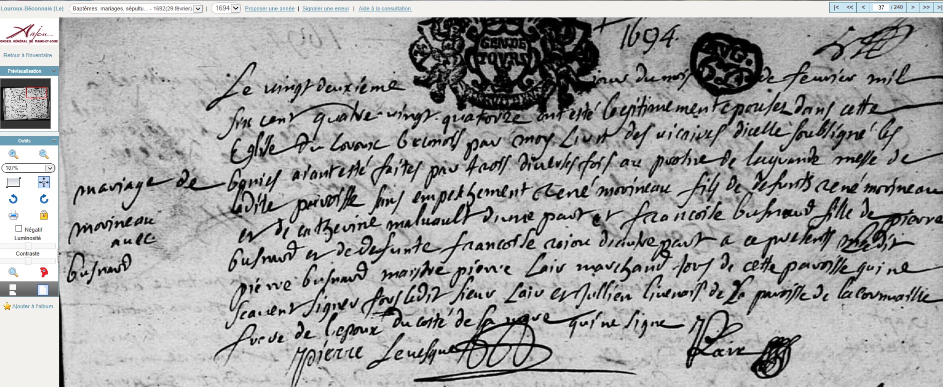 mariée le 22 février 1694 à Le Louroux-Béconnais - Maine-et-Loire (49), avec