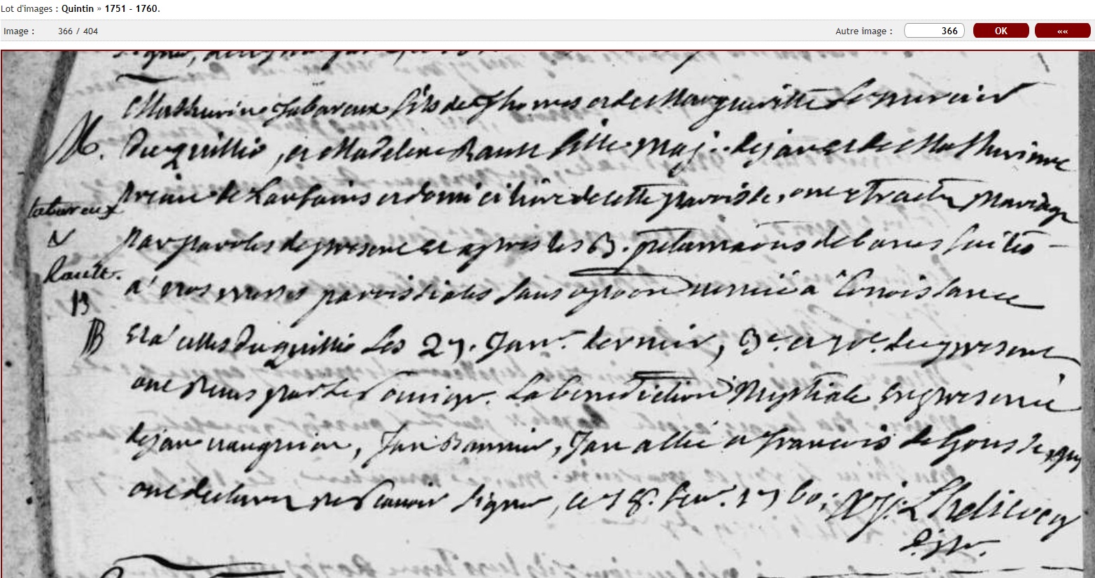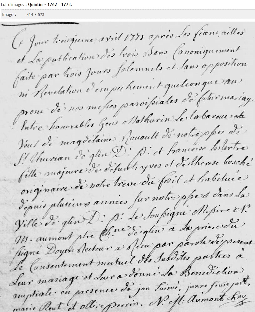 DCD sur acte mariage de sa fille. Veuf de Magdelaine Rouault, épousée à Quintin en 1760.