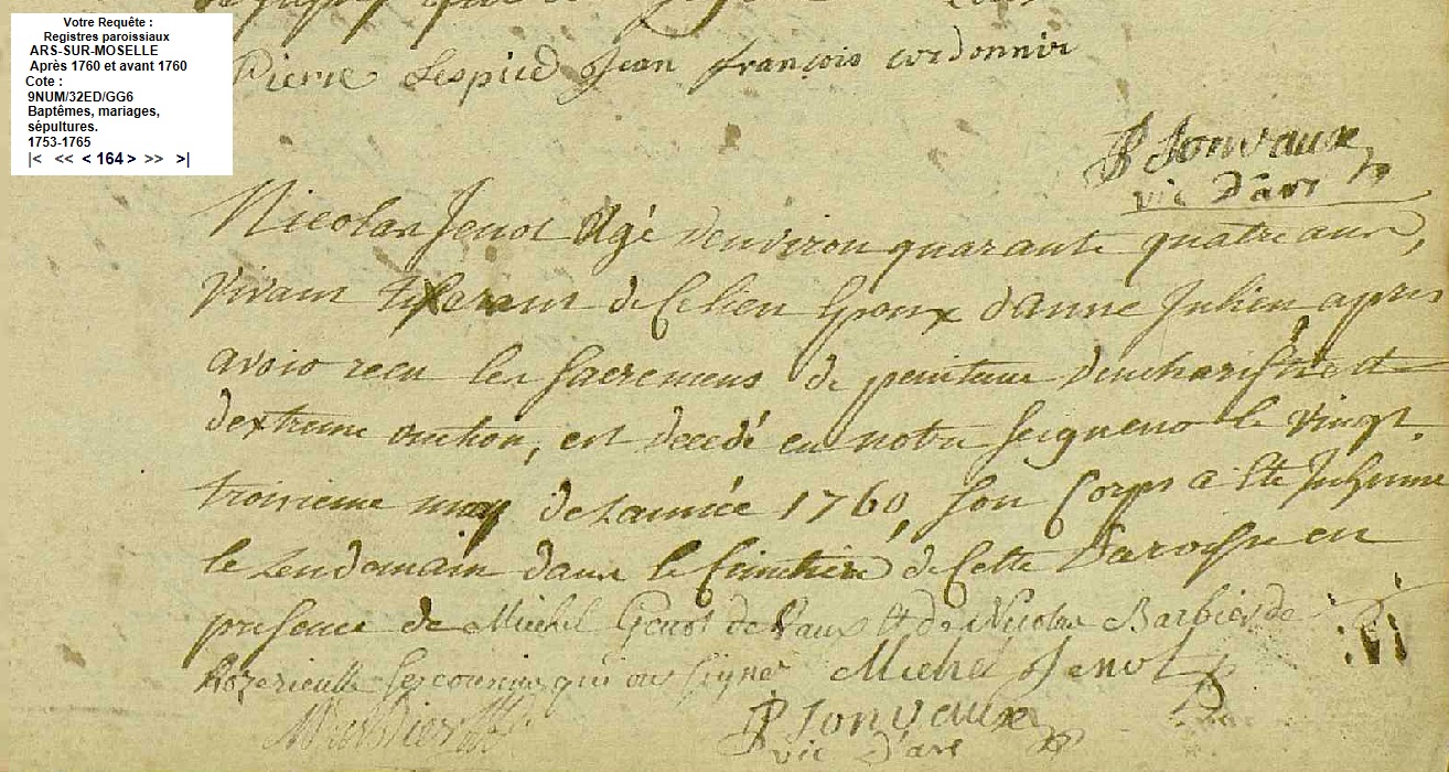 - décédé le 23 mai 1760 à Ars-sur-Moselle - Moselle (57) à l'âge de 44 ans environ