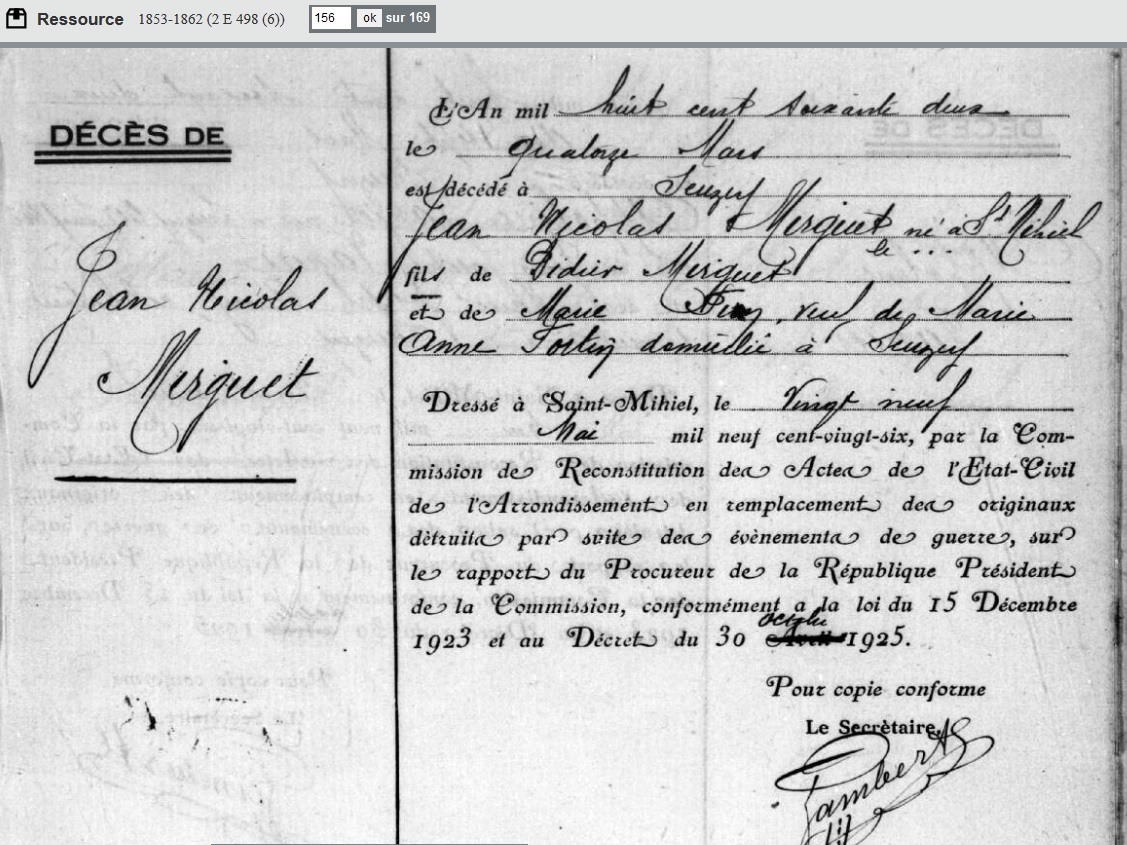 - décédé le 14 mars 1862 à Seuzey - Meuse (55) à l'âge de 77 ans 8 mois et 19 jours