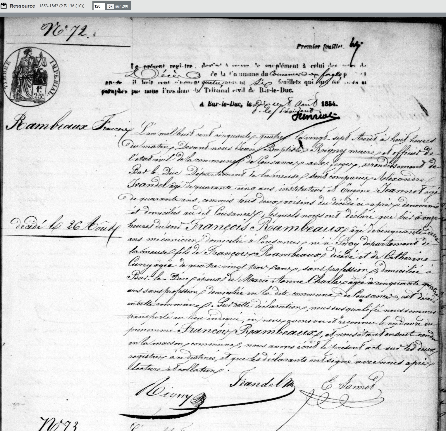 - décédé le 26 août 1854 à Cousances-les-Forges - Meuse (55) à l'âge de 53 ans 2 mois et 6 jours
