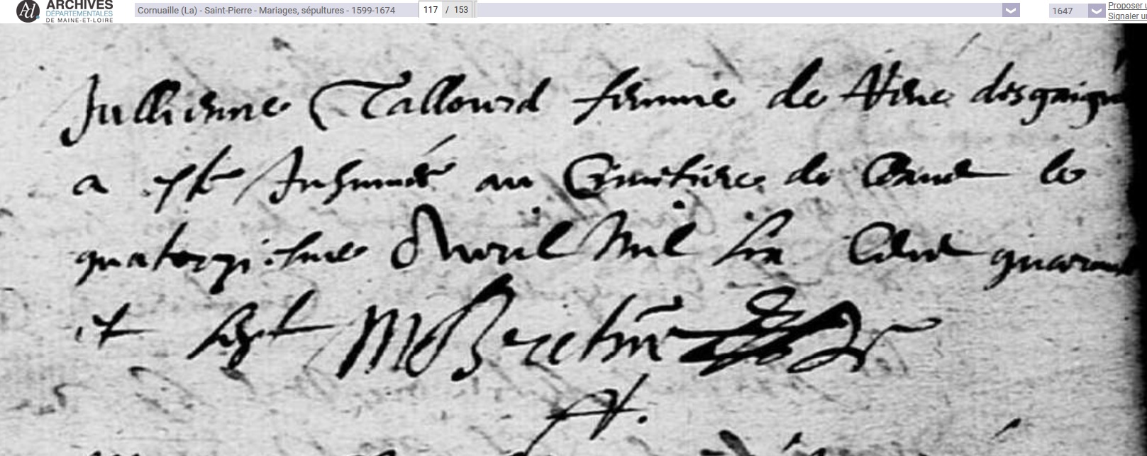 décédée le 14 avril 1647 à La Cornuaille - Maine-et-Loire (49) à l'âge de 60 ans 7 mois et 1 jour