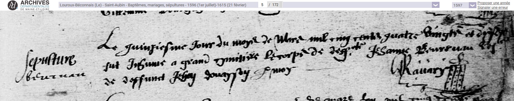 décédée le 15 mars 1597 à Le Louroux-Béconnais - Maine-et-Loire (49)