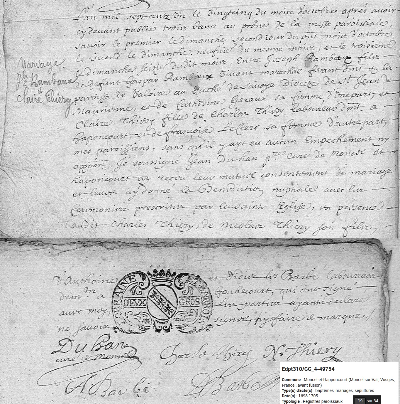 mariée le 25 octobre 1701 à Moncel-sur-Vair - Vosges (88), avec