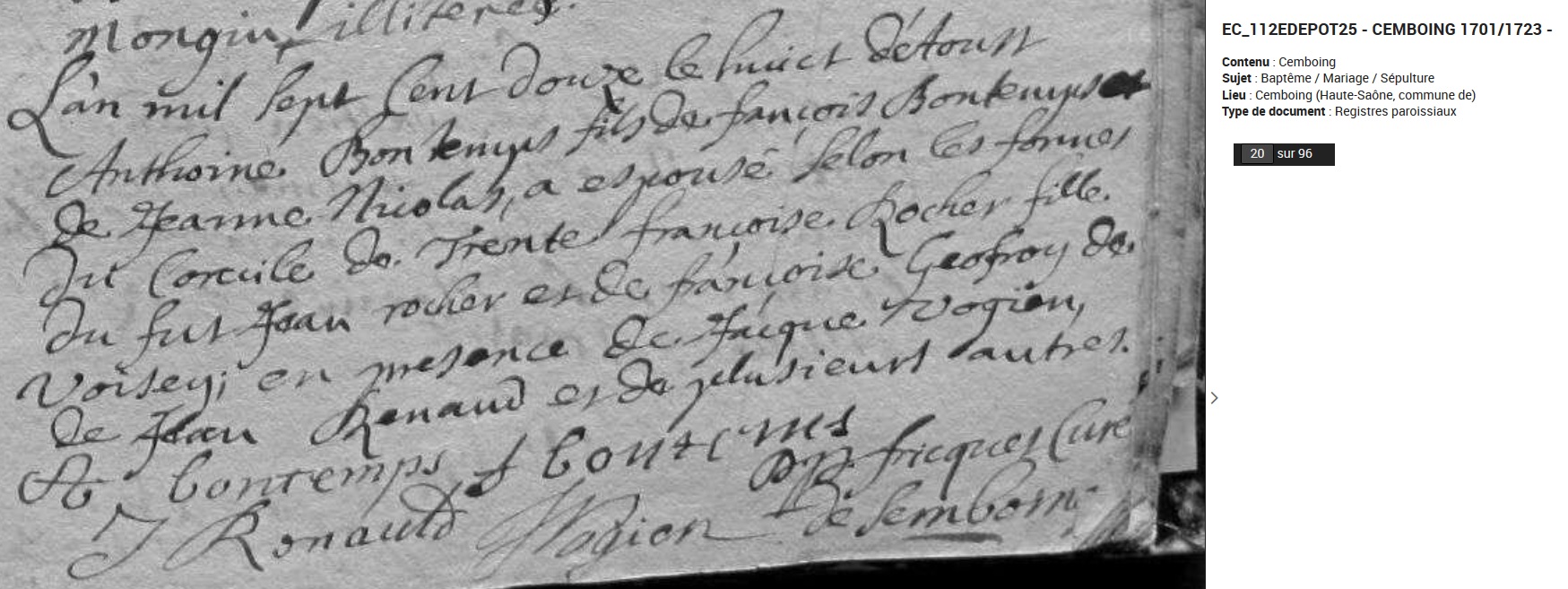marié le 8 août 1712 à Cemboing - Haute-Saône (70), avec
