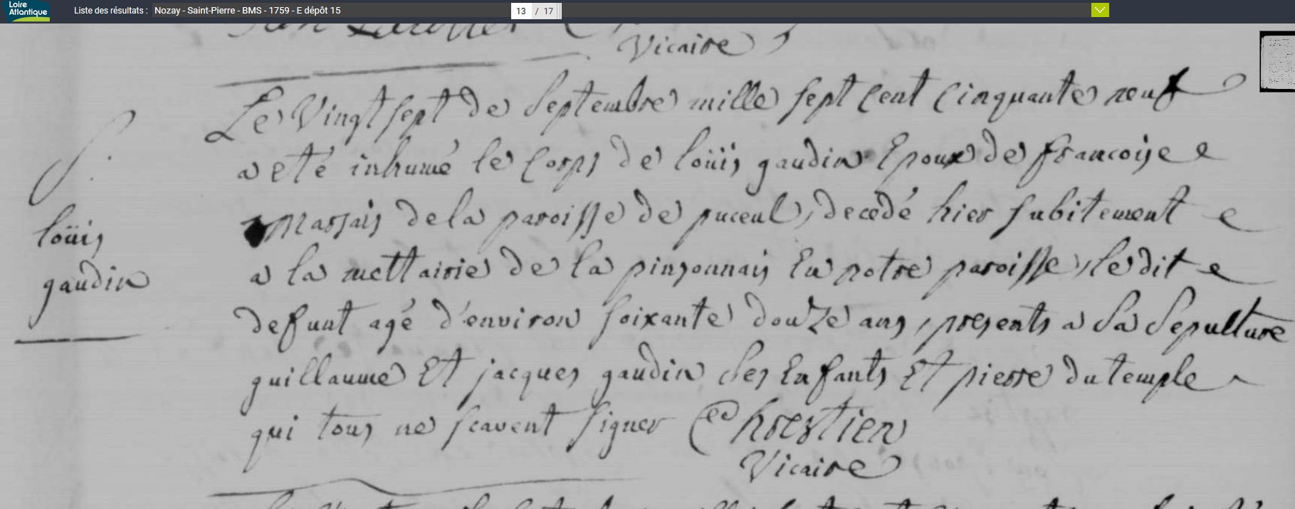 décédé le 27 septembre 1759 à Nozay - Loire-Atlantique (44) à l'âge de 73 ans environ