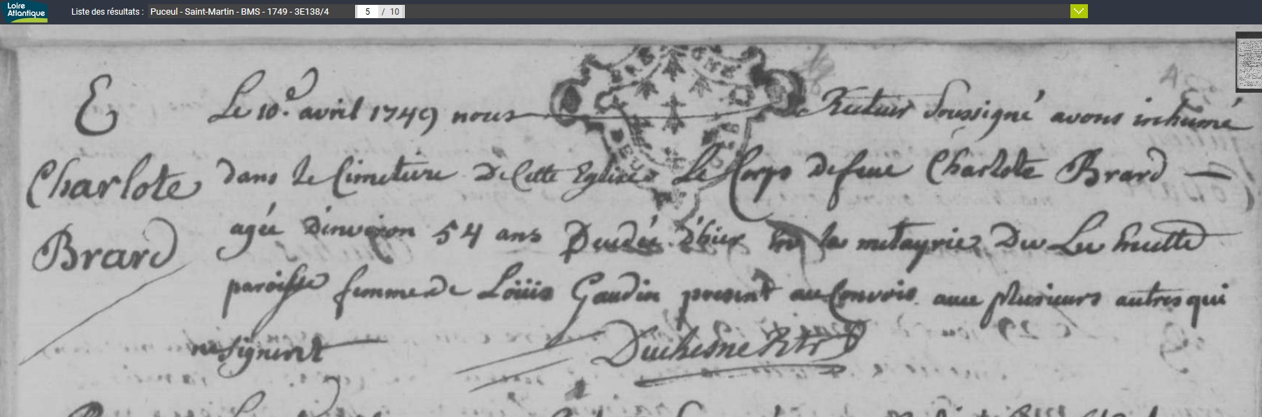 décédée le 10 avril 1749 à Puceul - Loire-Atlantique (44) à l'âge de 54 ans environ